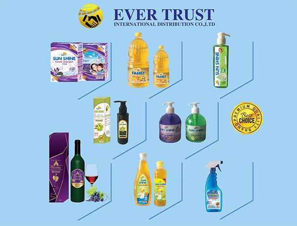 Ever Trust International Distrubution Co.,Ltd မှ Sun Shine အမှတ်တံဆိပ်ဖြင့် Olive Oil, Glass Cleaning, Soap, Lotion and Shower စသည့် လူသုံးကုန်ပစ္စည်းအမျိုးမျိုး၊ Freedom’s Way ၊ Commando အမှတ်တံဆပ်ဖြင့် Energy Drink အမျိုးမျိုး၊ Family အမှတ်တံဆိပ်ဖြင့် ဆုံဆီ မြေပဲဆီစစ်စစ်၊ Mandalay Wine အမှတ်တံဆိပ်ဖြင့် Wine၊ Nomex Lubricants အမှတ်တံဆိပ်ဖြင့် Lubricants များကိုလည်း တင်သွင်း၊ ထုတ်လုပ် ဖြန့်ဖြူးရောင်းချပေးနေပါသည်။